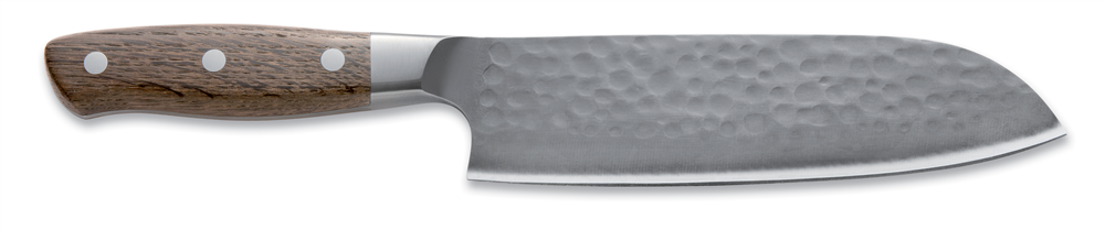 Das Santoku aus der geschmiedeten Serie ActiveCut gilt als asiatischer Klassiker für Gemüse und Fleisch und gehört damit zum Basissortiment in der Küche. Es zeichnet sich durch eine dünne Klinge mit keilförmigem Anschliff aus. Das spitze Klingenende dient zum Dekorieren. Durch den Kullenschliff entstehen Luftpolster, die das Anhaften des Schnittguts an der Klinge reduzieren. Der ergonomisch geformte Griff des Messers liegt angenehm in der Hand und ist spaltenfrei mit der Klinge verbunden. Der Halbkropf ermöglicht das komplette Nachschleifen der Klinge bis zum Schneidenende. Das edle Metall-Emblem im Griff ist ein Designelement und Eyecatcher, das die Wertigkeit der Messerserie unterstreicht. Klingenlänge: 18 cm. Messerklinge aus X30Cr13, Griff aus hygienischem Kunststoff. Die ausgewogene Härte von 54° HRC verbindet Schnitthaltigkeit und leichtes Nachschärfen. Made in Germany.